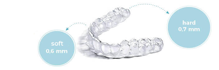Materialstärken über Wochen für ein einzigartig schönes Lächeln: Pro Behandlungsschritt tragen Sie nacheinander Schienen in unterschiedlichen Materialstärken. Sie beginnen mit der weichen Schiene (soft: Tragedauer ca. 7 Tage), wechseln anschließend auf die harte Schiene (hard: Tragedauer ca. 7 Tage)